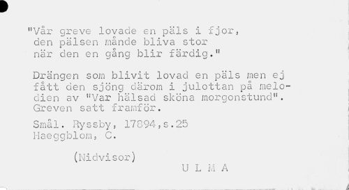 //// "Vår greve lovade en päls i fjor, den pälsen månde bliva stor när den en gång blir färdig." //// Drängen som blivit lovad en päls men ej fått den sjöng därom i julottan på melodien av "Var hälsad sköna morgonstund". i Gr even sa 11 f r a inf ör. i //// Smål. Ryssby, 17894,s.25 Haeggblom, C. //// (Nidvisor) //// U L M A //// w"\ A! ////