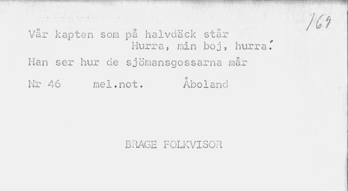 //// i Cc) //// Var kapten som pa halvdack står //// Hurra, min boj, hurra T //// Han ser hur de sjömansgossarna mår //// o //// Nr 46 mel.not. Aboland //// BHAGE FOLKVISOR ////