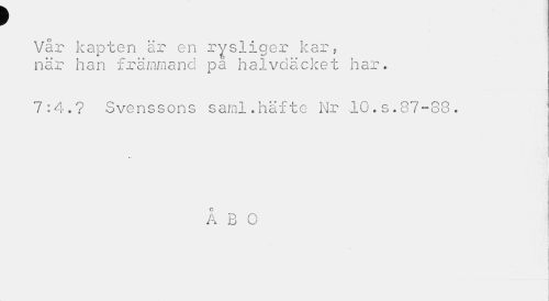 //// ) //// Vår kapten är en rysliger kar, när han främmand pa halvdäcket har. //// 7:4.? Svenssons saml.häfte Nr 10.s.87-88. //// i //// ÅBO //// i ////