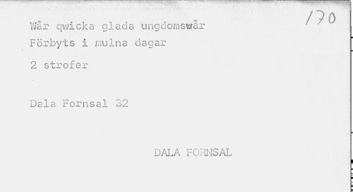 //// / ? o //// Wår qwicka glada ungdomswär Förbyts i mulna dagar //// 2 strofer Dala Fornsal 32 //// DALA FORNSAL //// i ¦ ////