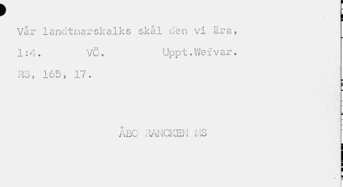 //// t E //// ¦ //// Vår landtmarskalks skål den vi ära, 1:4. VC. Uppt.Wefvar. //// R3, 165, 17. //// s //// ÅBO RANCKEN i.IS //// 5 ////