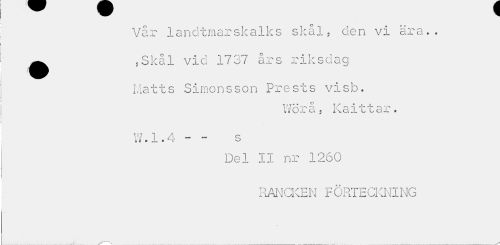 //// Vår landtmarskalks skål, den vi ära.. ^^ ,Skål vid 1737 års riksdag //// Matts Simonsson Pre sts visb. //// * * * ® * y r ? | i //// UOX Cl Kal L Ldi ? //// W 1 _ _ q //// i» tf • — » T O //// Del II nr 1260 //// RANCKEN FORTECKNING //// > ////