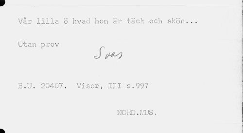 //// . ...-... //// Vår lilla ö hvad hon är täck och skön... //// Utan prov //// Siw //// E.U. 20407. Visor, III s.997 //// NORD. MUS . ////