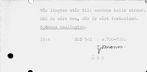 //// • ¦ ' . //// Vår längtan står till nordens kalla strand, Där är vårt hem, där är vårt fosterland. Sjömans hemlängtan * //// 10:4 SLS 541 s.730-733. //// ^'fhntrrvrv < ////