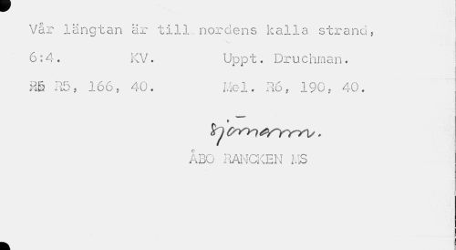 //// Vår längtan är till nordens kalla strand? 6:4. KV. Uppt. Druchman. //// R5, 166, 40. Mel. R6, 190, 40. //// ÅBO RANCKEN MS //// t, ////