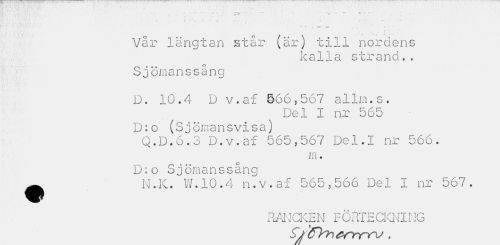 //// . . y ... _ //// .. •• • - . //// T * f. Mät //// Var längtan står (är) till nordens //// kalla strand.. //// Sjömanssång //// D. 10.4 D v.af 566,567 allm.s. //// Del I nr 565 //// D:o (Sjömansvisa) Q.D.6.3 D.v.af 565,567 Del.I nr 566. //// m. //// D:o Sjömanssång ^ N.K. W.10.4 n.v.af 565,566 Del I nr 567. //// RANCKEN FÖRTECKNING //// S/éThi ^nrroj, ////