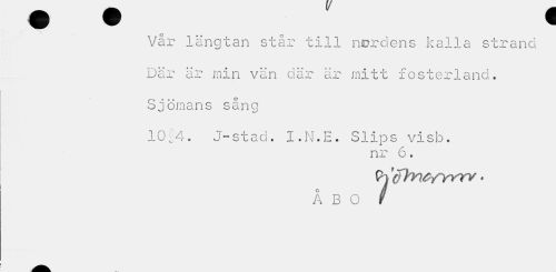 //// > * //// Vår längtan står till nordens kalla strand Där är min vän där är mitt fosterland. Sjömans sång //// 10;4. J-stad. l.N.E. Slips visb. //// nr 6. //// Ch < //// åbo r ////