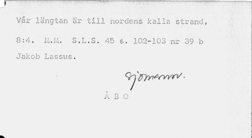 //// f*" //// Vår längtan är till nordens kalla strand, //// 8:4. M.M. S.L.S. 45 s. 102-103 nr 39 b Jakob Lassus. //// Å B O ////