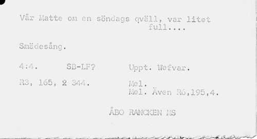 //// Vår Matte om en söndags qväll, var litet //// full //// Smädesång. //// 4:4. SB-LF? Uppt. Wefvar. //// R3, 165, 2 344. Mel. //// c * //// Me 1. Aven Ro.195.4. ÅBO RANCKE N MS ////
