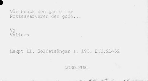 //// / //// Vår Noack den gamle far Potte svarvaren den gode... //// w' //// Vg //// Valtorp //// Mskpt II. Soldatsånger s. 193. E.U.21432 //// NORD.MUS. //// _ 1: s> ä, J> ¦:? / , I ////