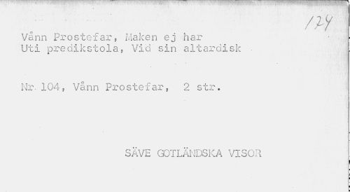 //// / ; /ii Vånn Prostefar, Maken ej har ' //// Uti predikstola, Vid sin altardisk //// Nr. 104, Vånn Prostefar, 2 str. //// SAVE GOTLÄNDSKA VISOR //// i i ////