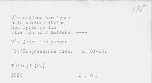 //// / ir //// ..Vår stjärna hon lyser hela världen ikiing Hon lyste de tre vise män till Betlehem — ~~ //// »UV» •»:.» r.-*« «-•':_•» //// Vår judas med pungen Stjärngossarnas visa. s. 61-62. //// * //// Töllsjö (Vg) //// 1816 I F G H ////
