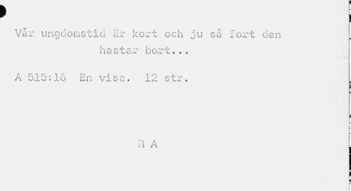 //// p //// Vår ungdomstid är kort och ju så fort den //// hastar bort... //// A 515:16 En visa. 12 str. //// = //// R A | //// i ////