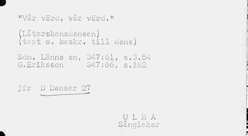 //// "Vår värd, vår värd." //// (Lå ter ske ns danse n) //// (text o. be skr. till dans) //// Sdm. Länna sn> 347:61, s.3.54 G.Eriksson 347:66 , s.162 //// jfr D Danser^27 //// U L M A //// Sånglekar I //// k, - i ////