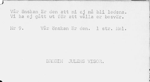 //// y f //// Vår önskan är den att ni ej må bli ledsna. Vi ha ej gått ut för att vålla er besvär. //// Nr 9. Vår önskan är den. 1 str. Mel. //// I //// BRODIN JULEKIS VISOR. ////