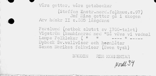 //// Våra getter, våra getabockar //// (Steffen Enstr.norc.folkmus.s.97) Jmf Mina getter gå i skogen //// •Arv hdskr II s.335 långdans //// Forslund (notbok slutet av 1700-talet) Vigström (kombinerad med "Så väva vi vadmal Lampa Folklekar ( " " » //// Dybeck Sv.vallvisor och hecmlåtar Saxon Nerikes folkvisor (även tysk) //// BRODIN RIM KOMiMENTAR //// ffnäW //// .---...''f ---*''^'AlpV^l^lM^^r'V^ ,vr^-t-w- --- ---,---."WWW-~---— -— ////
