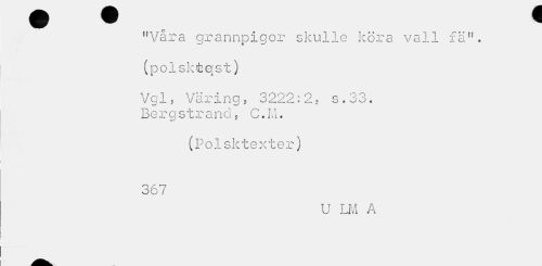 //// "Våra grannpigor skulle köra vall fä", (polskfeqst) //// Vgl, Väring, 3222:2? s.33. Bergstrand? C. 1.1. //// (Polsktexter) //// 367 //// U L M A ////
