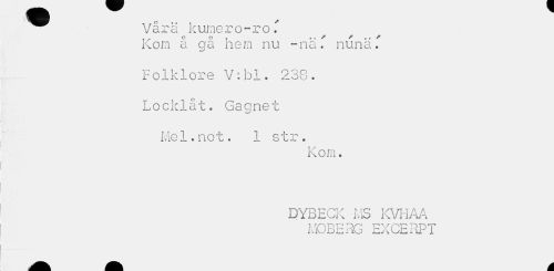 //// ^^ Våra kumero-ro.' //// Kom å gå hem nu -nä.' nunä.' //// Folklore V;hl. 238. //// Locklåt. Gagnet //// Mel.net. 1 str. //// Kom. //// DYBECK MS KVHAA MOBERG EXCERPT ////