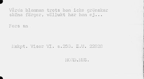 //// r | //// Vårda blomman trots hon icke grönskar sköna färger, vällukt har hon ej... //// Fors sn //// Hskpt. Visor VI. s.253. E.U. 22828 //// N0.I:1D. MUS. //// k ////