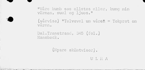 //// "Våre kumb sos olistas eller, kumg min värman, suol og ljuos,tf //// (vårvisa) "Tolvavel um våreft = Tokprat om våren. //// Dal.Transtrand, 345 (fol.) Hansback. //// (Nyare skamtvi sor). //// U L M A //// ...— ---»»W^-V^^-^^r^-^-r-t---—.W-. . . ___K-w*^ ^^m--- . .___„ ////