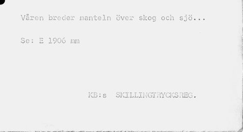 //// i » //// Våren breder manteln över skog och sjö,.. I //// f //// Se: H 1906 mm j //// i //// i f //// i i i //// KB:s SKILLINGTRYCKS REG. //// I //// i //// ___^^ ^ ,Jj ////