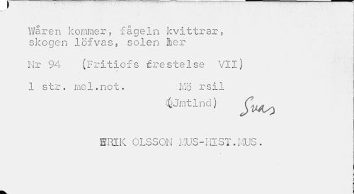 //// , " 4 . //// Wåren kommer, fågeln kvittrar, skogen löfvas, solen Iher //// ¦ //// Nr 94 (Fritiofs frestelse VII) //// X //// 1 str. me 1. no t.. Mö r s i 1 //// (fcJmtlnd) //// ERIK OLSSON MUS-HlST.MUS. ////