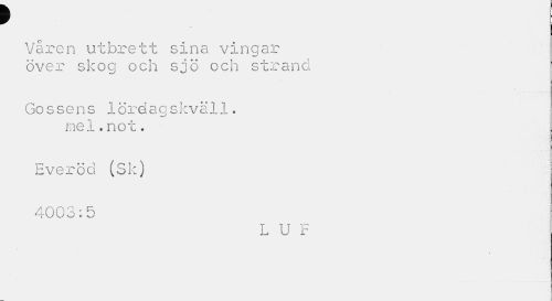 //// f //// t //// Våren utbrett sina vingar över skog och sjö och strand //// Gossens lördagskväll. mel.not. //// Everöd (Sk) //// 4003:5 //// L U F ////