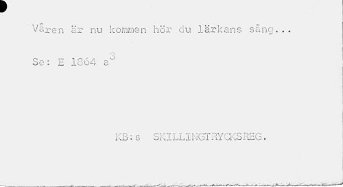 //// w //// • 1 //// Våren är nu kommen hör du lärkans sång... //// O //// Se: E 1864 a" //// • | //// KB:s SKILLINGTRYCKSREG. ////