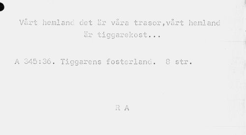 //// t //// Vårt hemland det är våra trasor,vårt hemland //// är tiggarekost... //// A 345:36. Tiggarens fosterland. 8 str. //// n a 11 M ////