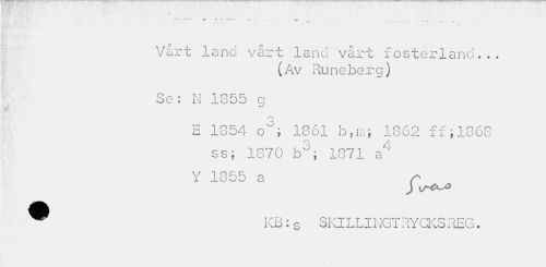 //// ---• '--- '<r r> V"—. //// t — - • - 4 ...- //// Vårt land vårt land vårt fosterland... //// (Av Runeberg) //// Se: N 1855 g //// E 1854 ov", 1861 b,m; 1862 ff,1868 //// ss; 1870 b°; 1871 a4 Y 1855 a r //// ® KB:s SKILL1MGTRYCKSREG. ////
