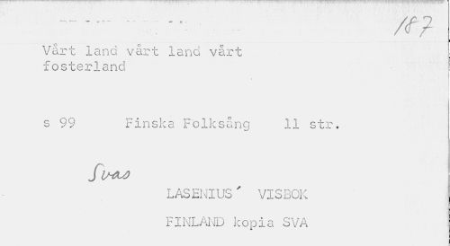 //// /(T r //// Vårt land vårt land vårt fosterland //// I* i I //// s 99 Finska Folksång 11 str. //// LASENIUS' VISBOK FINLAND kopia SVA ////