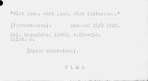 //// W j //// "Vårt land, vårt land, vårt fosterland." //// B //// (Travestering). Daterad 27/2 1918. //// Dal. Grangärde, 11482, s.214-216. //// il) jL 1 t y v. v' e i //// (Nyare skämtvisor). //// U L M A ////