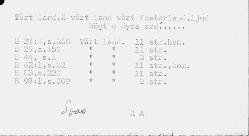 //// fart land , ö vårt land vårt fosterland,ljud //// högt o dyra ordf... //// B 27:1?s.360 Vårt land. 11 str.kom. //// P, 90 e 1 RO ff U 11 0 4- //// j_j</y?b.J_vJO ii Sli. //// R 44 c ] un q //// U r v j O • J_ O o Gx . //// B 62 ' 1 Q 39 U ]] rf-n \rnn //// U VJ ^ • JL 5 O • O*^ JL JL O L-L • 5 J.'w U i il * //// B 83, s. 220 » 11 11 str. //// B 98:l5s.209 " » 3 str. //// J Ir^O H A //// v ^ \ //// . . ___. ^ a. -m* i J ////