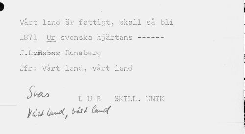 //// f j //// Vårt land är fattigt, skall så bli 1871 Ur svenska hjärtans--- //// J. L Ä b k r Hu n e b g r g , //// Jfr: Vårt land, vårt land //// _ Au . „. _ „„,„ ////