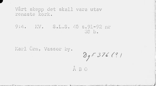 //// Vårt skepp det skall vara utav renaste kork. //// Q • A KV S T S z1 ^ q Q] -QO nr //// y « r • JL\.V • • Ju • O c , w o * y J_ y 11-L //// O O K JO D . //// i: IS //// Karl Orn, Vassor by. //// ÅBO i //// I ////