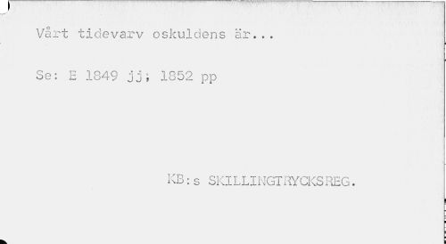 //// Vårt tidevarv oskuldens är... Se: E 1849 jj; 1852 pp //// KB:s SKILLINGTRYCKSREG. //// j ¦ ¦ //// k. C ////