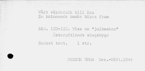 //// "* " f" T " <" V'* — » - r-- ^ //// A »V ' V : • ir . . * i ii,- s ' i | //// s //// Vårt värdefolk till ära En brinnande buske bäres fram //// Sid. 122-123. Visa om "julbusken11 //// Ostergotlands skogsbygd //// Endast text. 1 str. ® DYBECK RUNA De c.-Häft.1844 ////