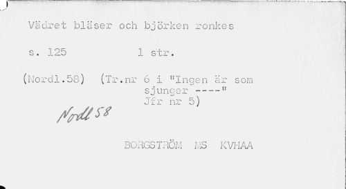 //// » //// Vädret bläser och björken ronkes //// s. 125 1 str. //// (Nordl.58) (ir.nr 6 i "Ingen är som //// sjunger Jfr nr 5) //// sfaär* //// BORGSTRÖM MS KVHAA //// k. ////