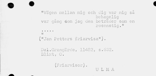 //// "Vägen mellan mig och dig var mig så //// behagelig //// var gång som jag den beträder som en //// rosenstig.11 //// ii //// ("Jan Petters friarvisa"). Dal.Grangärde, 11482, s.632. //// Dl A 4- n //// U J_ J- / v L j v. . //// (Friarvisor). //// U L M A //// 4 ////