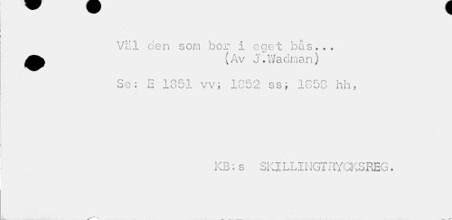 //// Väl den som bor i eqet bås... //// i * //// (Av J.WacSman) Se: E 1851 vv; 1852 ss, 1858 hh, //// KB;s SKILLINGTRYCKSREG. ////