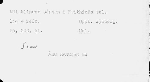 //// ! //// Väl klingar sången i Frithiofs sal, 1:4 refr. Uppt. Sjöberg. //// Ro. 203, 61. Mel ,. //// S0-eLsO //// ÅBO RANCKEN LS : //// i //// k ////