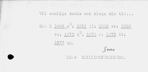 //// > //// ' "" ¦ • * ' 'Ja~ t . . « "•' ' » //// «.v —i® i . #<lt . • « T //// Väl somliga sucka och klaga sin tid.,. //// o //// Se: E 1849 a"; 1851 jj; 1865 ss; 1868 //// tt; 1872 q3; 1873 r; 1875 tt; 1877 qa, //// w*. '-a mbcbokummmommmm*» «• i» //// ^^IhC-O //// (f) KB: s SKILLINGTRYCKSREG. ////
