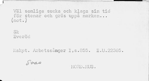 //// / • * 1 . Väl somliga sucka och klaga sin tid //// o //// för stenar och gräs uppa marken... (not. ) //// Sk j //// Everöd //// Mskpt. Arbetssåmger I.s.855. E.U.22365. //// NORD.MUS. ////