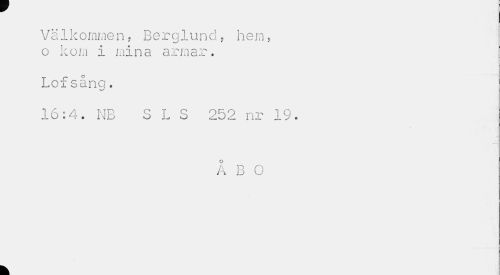 //// Välkommen. Berglund, hem, o kom i mina armar. //// Lofsång. //// 16:4. NB S L S 252 nr 19. //// Å B O //// t ////