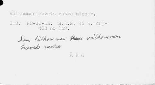 //// ¥ //// Välkommen havets raska männer, //// 3:8. FC-JO-LE. S.L.S. 46 s. 401- //// 402 nr 152. //// A B O //// . . ___. .< ,h.r.::;J:bmA ////