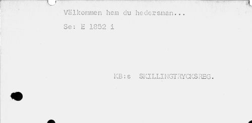 //// Välkommen hem du hedersman... Se: E 1852 i //// KB:s SKILLINGTRYCKSREG. //// t 9 ////