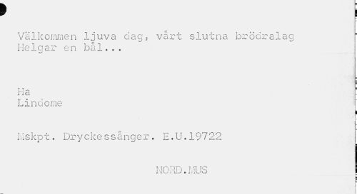 //// f I //// r— //// Välkommen ljuva dag, vårt slutna brödralag Helgar en bål... //// Ha //// Lindome //// 1 //// r— //// Mskpt. Dryeke ssånger. E.U.19722 //// NORD. MUS //// i //// i i ////