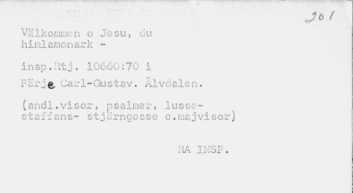 //// Jt( //// Vä1komnen o Jesu, du himlamonark - //// insp.Rtj. 10.660:70 i //// tt * //// Färjg, Carl-Gustav. Älvdalen. //// (andl.visor, psalmer, lussest a f f a n s - stjärngosse o.majvisor) //// RA INSP. ////