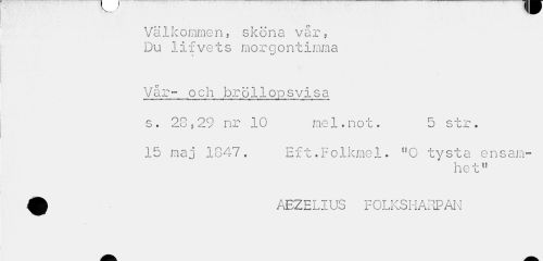 //// Välkommen, sköna vår, Du 1ifve ts mor g ontimma //// Vår- och bröllopsvisa //// »cr-iOwi. i ¦n-.-rMWm&m III »'UK» v- '^'i... m »»In n i W»', WBI...« »¦»'-/¦¦•p-^i - - —m » i 10 i 111 1 ei wm //// s. 28,29 nr 10 mel.not. 5 str. //// 15 maj 1347. Eft.Folkmel. "0 tysta ensam- //// he t" //// ^ AEZELIUS FOLKSHARPAN ////