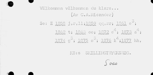 //// Välkommen välkommen du klara... //// (Av C.A.Nicander) //// O //// Se: E 1358 j, r.11;1859 o; c.rr; 1861 eJ; //// ¦ i — l 111 i —...*- ; M— j» j- »III il. ^mmmrnnm //// 4 A //// 1 OAO 4- < 1 O^Q ^ * 1 Q79 O ' * 1 P7 ^ ^ ' • j_oU.il u j iuOo OO j iu / Z e f ±u I o a. , //// »w^r I XI »--ml tBMW^anWi."NMWiAfl »fc-' i i»I « i»i ¦¦¦ ¦>»i»IJ— m"—' //// f^ A //// 1374 g°; 1375 o°; 1876 k";1877 hh, //// Ifcoi:, II» 11 i '» — i i.^t fc/ unidifMMVM^.-'* ti.v »f< TFU» » .. ni»n • iinjnwc» //// KB : s SKILLINGTRYCKSREG. //// j ////